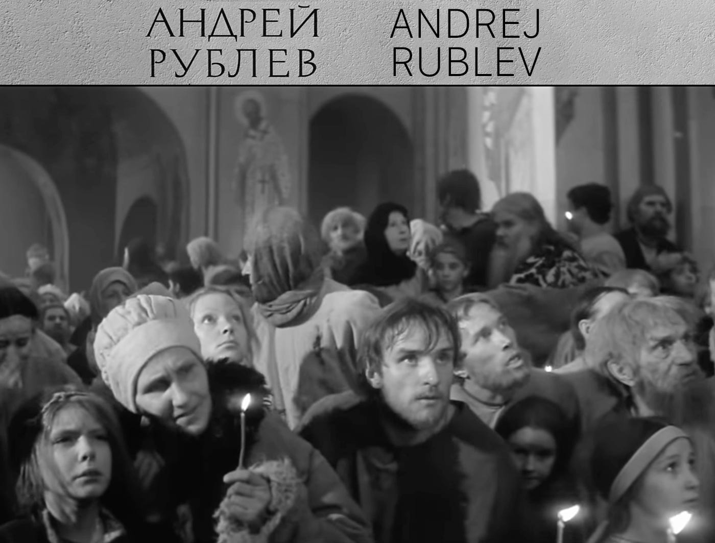La folla raccolta nella cattedrale attende in silenzio. Il pittore di icone, il monaco Rublev, è tra loro. Lo vediamo al centro dell’immagine con lo sguardo rivolto verso l’alto, come interrogando l’ignoto: E ora?